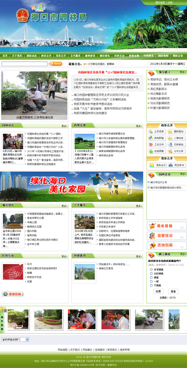 案例背景:??谑袌@林管理局是全市園林綠化行政管理部門,負(fù)責(zé)園林行業(yè)管理,城市綠地系統(tǒng)規(guī)劃,園林綠地建設(shè)、管理及養(yǎng)護(hù),園林科研等主要工作。??诔鞘袌@林綠化建設(shè)是發(fā)展??诼糜萎a(chǎn)業(yè)的重要基礎(chǔ),是提高城市品位、改善人居環(huán)境的重要措施,目前建城區(qū)綠地率達(dá)37.1%,綠化覆蓋率41.2%,人均公共綠地面積12平方米。