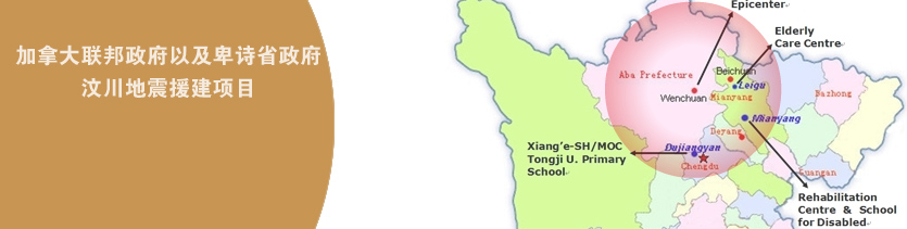 援建項目的第一期工程已經(jīng)在有條不紊的進(jìn)行之中,包括重建都江堰向峨小學(xué)、綿陽的一所殘疾人康復(fù)學(xué)校、以及北川擂鼓鎮(zhèn)的一所養(yǎng)老院,全部位于被地震嚴(yán)重?fù)p毀區(qū)域。所有的重建建筑都將采用加拿大先進(jìn)的現(xiàn)代木結(jié)構(gòu)建筑技術(shù)以期達(dá)到好的抗震和節(jié)能效果。