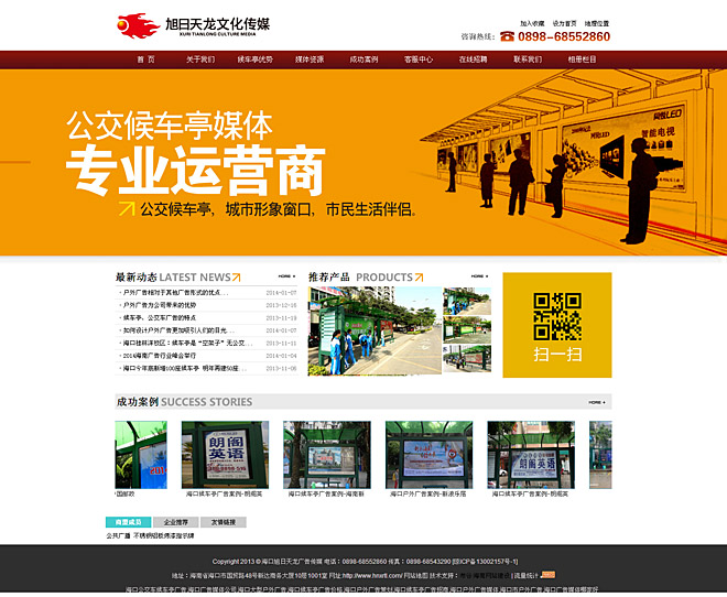 海南旭日天龍文化傳媒有限公司是一家集??趶V告媒體開發(fā)、經(jīng)營、發(fā)布,大型商業(yè)活動策劃執(zhí)行的文化企業(yè)。目前公司基礎主業(yè)是專業(yè)從事??诤蜍囃V告、??趹敉鈴V告經(jīng)營發(fā)布,現(xiàn)公司自身擁有海口市及全島各縣市公交候車亭燈箱媒體近600個廣告位,媒體終端有效覆蓋大型商業(yè)區(qū)、樓盤、學校、機關(guān)單位、車站等人流、車流旺區(qū),與國內(nèi)多家品牌客戶建立了長期廣告發(fā)布合作關(guān)系。